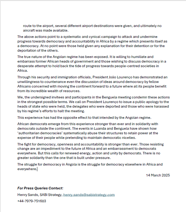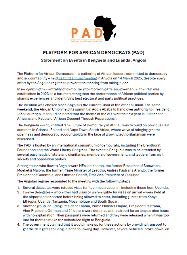 O presidente da UNITA, Adalberto Costa Júnior, confirmou ao MisaCheck que ‘‘os encontros foram organizados sob a responsabilidade da Brenthurst Foundation, com o patrocínio da Fundação Konrad Adenauer e do World Liberty Congress’’. Além disso, Adalberto Costa Jr. enviou-nos a Declaração Conjunta da Plataforma para Democratas Africanos (PAD), documento no qual se esclarece que o evento realizado no dia 14 de março em Benguela, intitulado “O Futuro da Democracia na África”, foi uma iniciativa da PAD, uma organização composta por um consórcio internacional de democratas, incluindo a Brenthurst Foundation e o World Liberty Congress. O objectivo do evento era dar continuidade a encontros anteriores realizados pela PAD em Gdansk, na Polônia, e na Cidade do Cabo, na África do Sul, nos quais se discutiram formas de promover maior transparência e responsabilização democrática diante do crescimento do autoritarismo no continente africano, como se pode ler nas fotos abaixo.